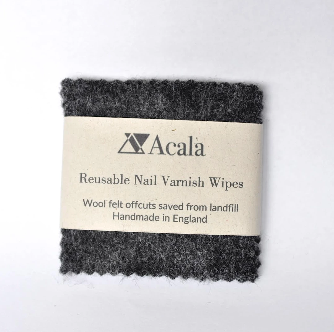 Reusable, washable wool grey-black felt pads with a mildly abrasive surface for removing nail varnish. These pads are made from wool offcuts that would otherwise have gone to a landfill. ToΒ extend the life of your reusable nail polish remover pads we recommend washing them with a bar soap as soon as you’ve finished using them to remove any nail varnish on the pads. Then lay them out to dry. If using traditional nail varnish remover, the pads will harden a little with use but this will not detract from their effectiveness. Hand washing is best with these, so avoid placing in the washing machine.