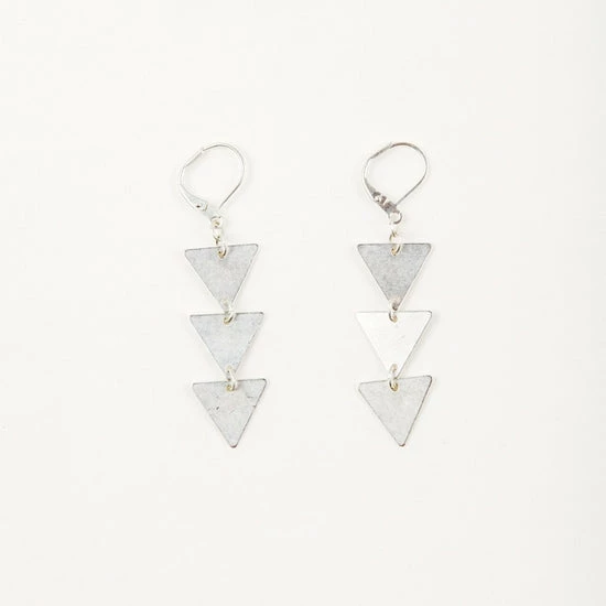 Add a pop of geometric shine to your look with this triple stack of triangles. 1.5″ L silver plated, Leverback closures. The triple triangle earrings are handmade in a fair trade workshop in Guatemala.