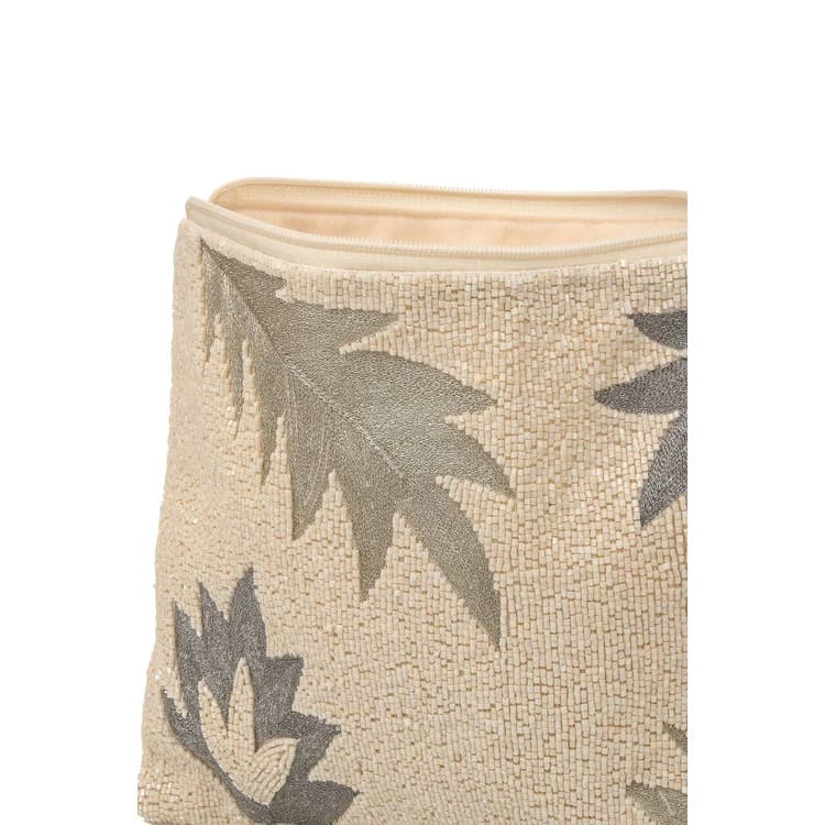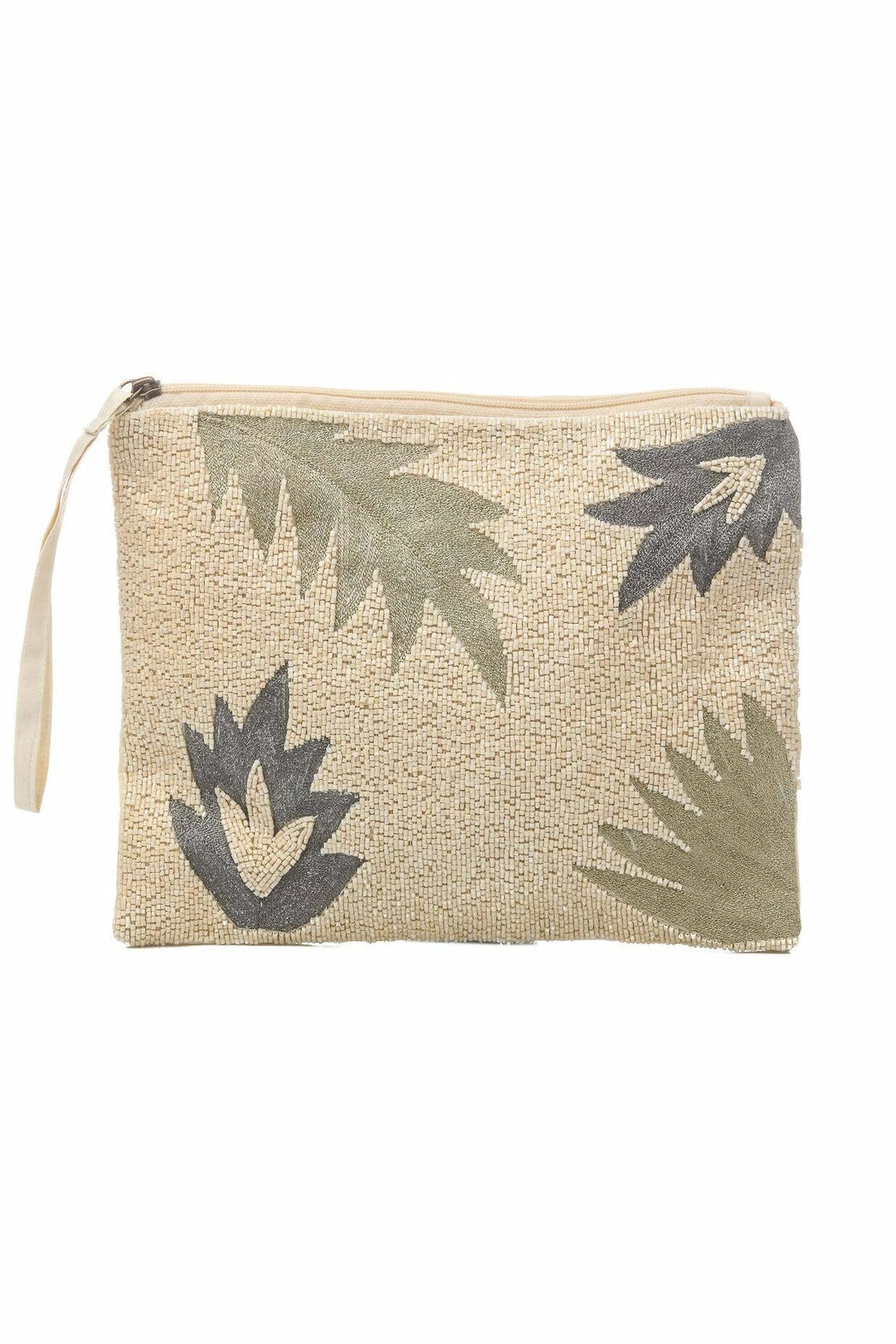 A glamorous stunning classy unique and trending hot must-have bag features a beautiful leaf pattern seed beaded clutch bag design. Perfect for business casual occasions! Available in ivory.