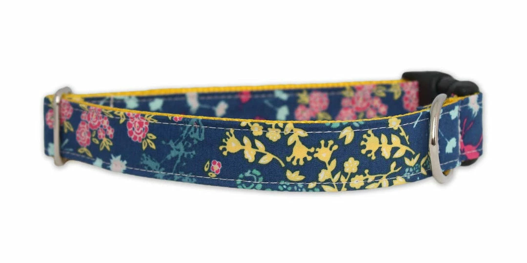 The Nora Dog Collar is gorgeous with pink, yellow and teal flowers on a navy background. It is the perfect fit for any stylish, trendy pup. Our collars are made with designer fabrics and your choice of either a traditional black plastic buckle or our signature SP metal buckle. The nylon webbing core has a tensile strength of 2100 lbs., so they can withstand pulling by even the strongest of dogs. Sophisticated Pup collars are machine washable.