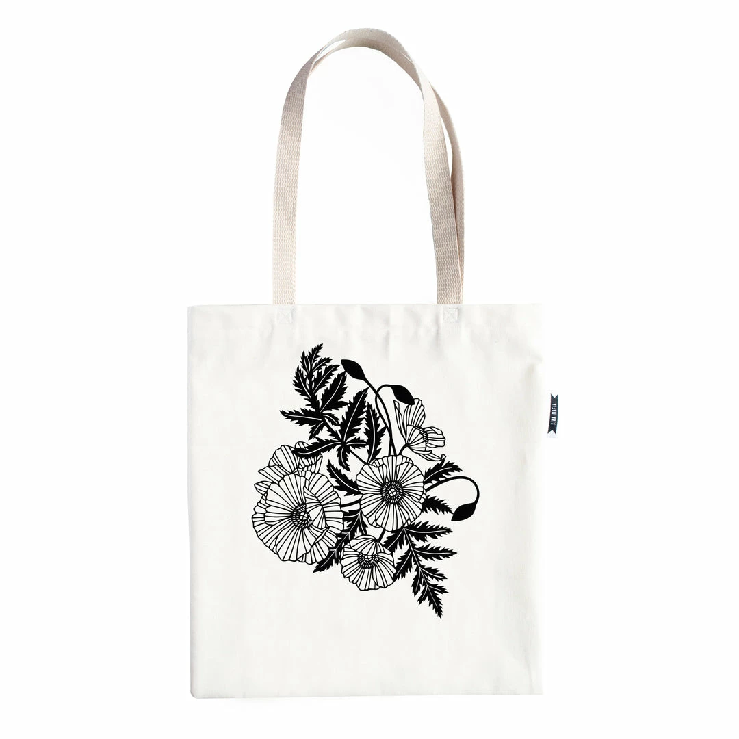 Our Poppies tote bags are hand-printed and handmade in Portland, OR. Carry your everyday essentials or use as a reusable shopping bag. Handmade Size : 15 x 16 inches (38 x 40 cm) Material : 100% organic cotton Ink color : black, non-toxic ink Design : Like all bird mafia designs, our “poppies” print was cut by hand from paper before becoming a screen-print design. Care instructions : Wash in cold water. Air dry. Made in USA.