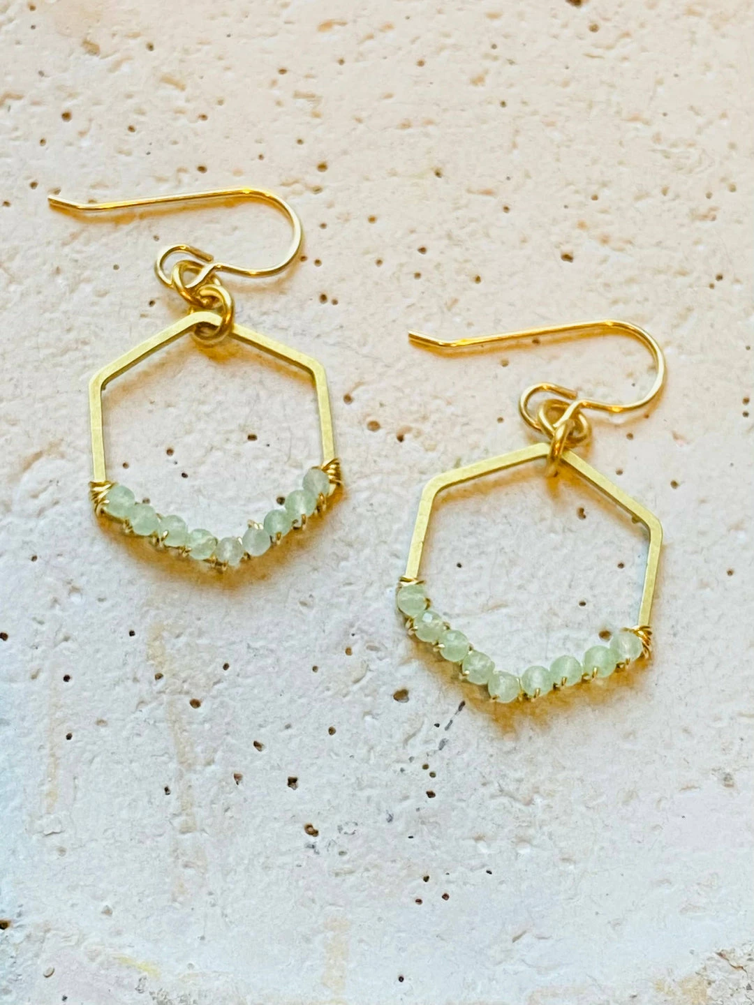 The small hexagon is hand wrapped using 2mm microfaceted, aventurine gemstones.