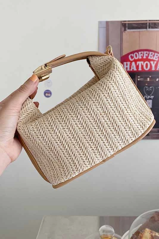 Cute summery vibe woven handbag. This cute mini handbag shapes by woven fabric with a sturdy silhouette, a flat bottom design and a tote handle with buckle.
