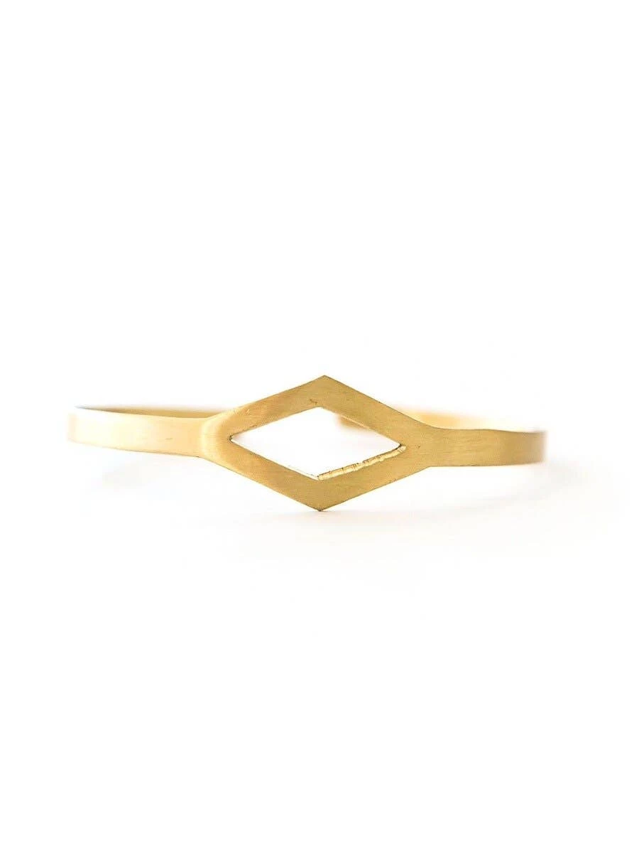 This adjustable brass cuff has a delicate rhombus cut out for a fun geometric pattern.