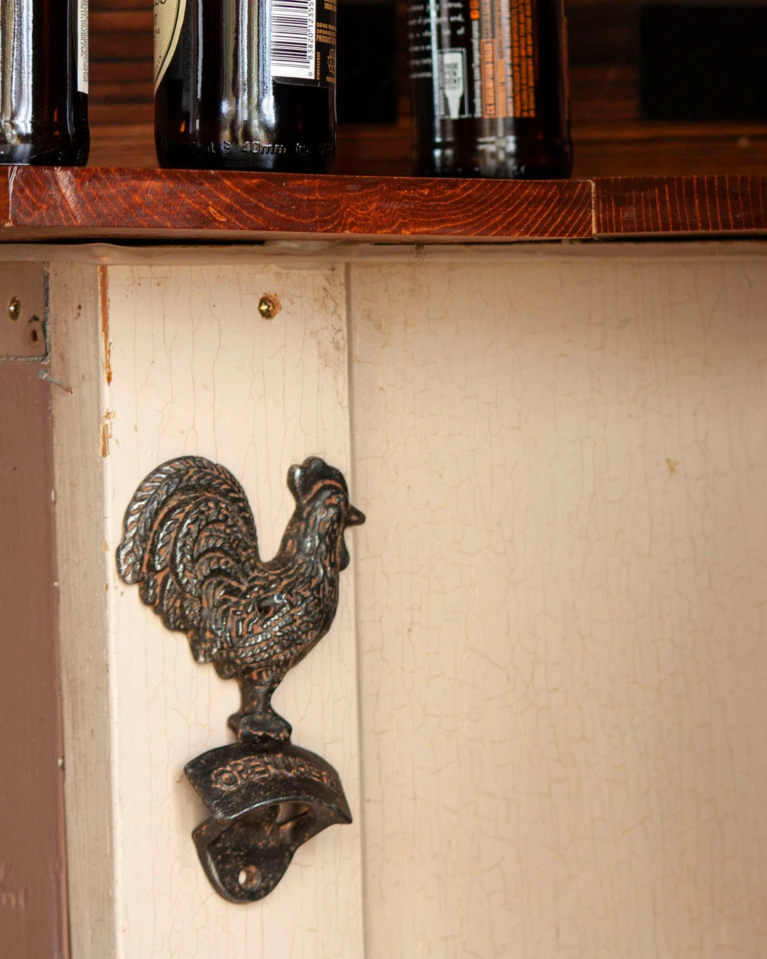 -Cast iron embossing shows details on the rooster with a rusted wash finish. “Open Here” is debossed on opener.