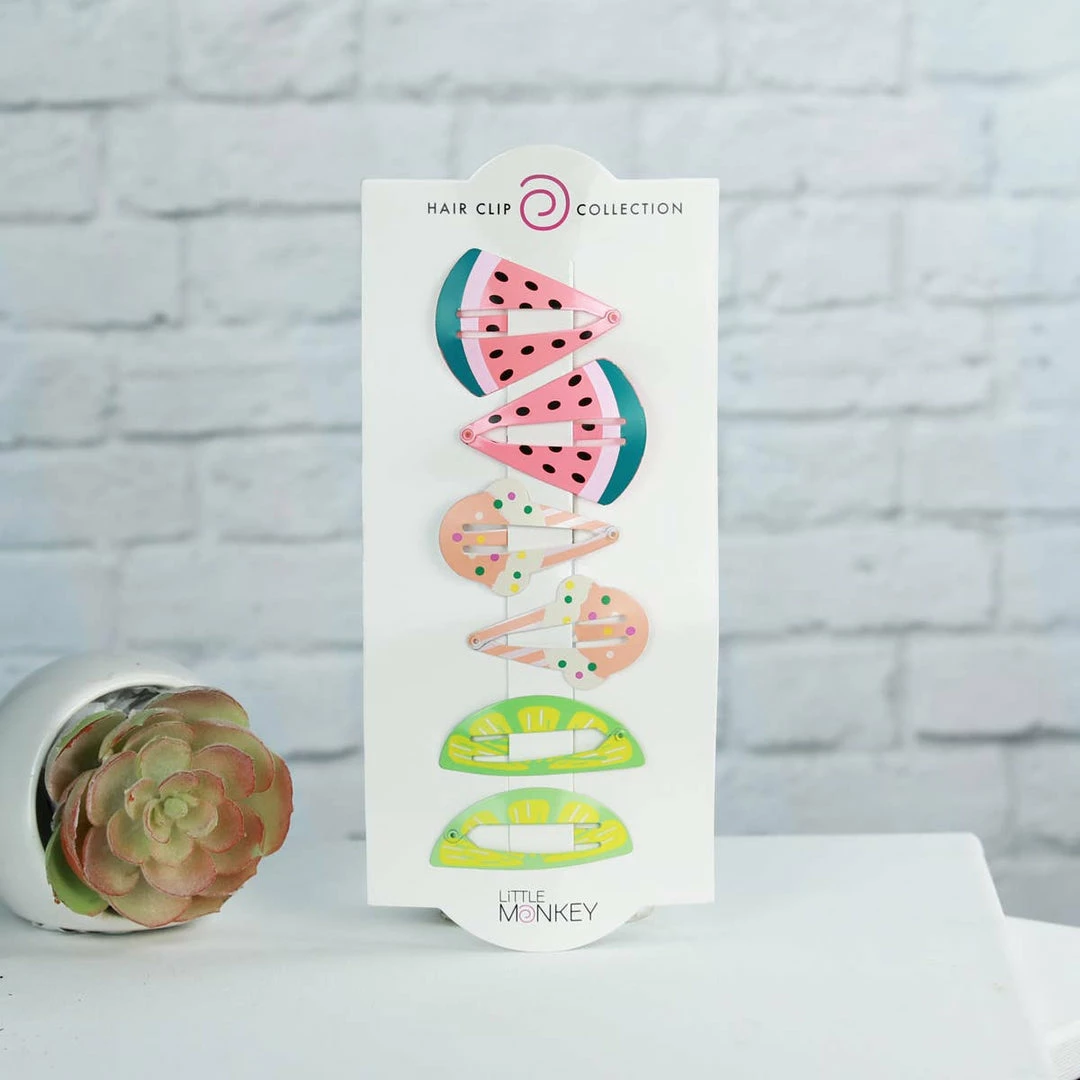 Summer Sweet hair Clips include 2 of each of the following – Watermelon, Ice Cream Cone, Limes.. Adorable to add a little spunk your little ones hair.