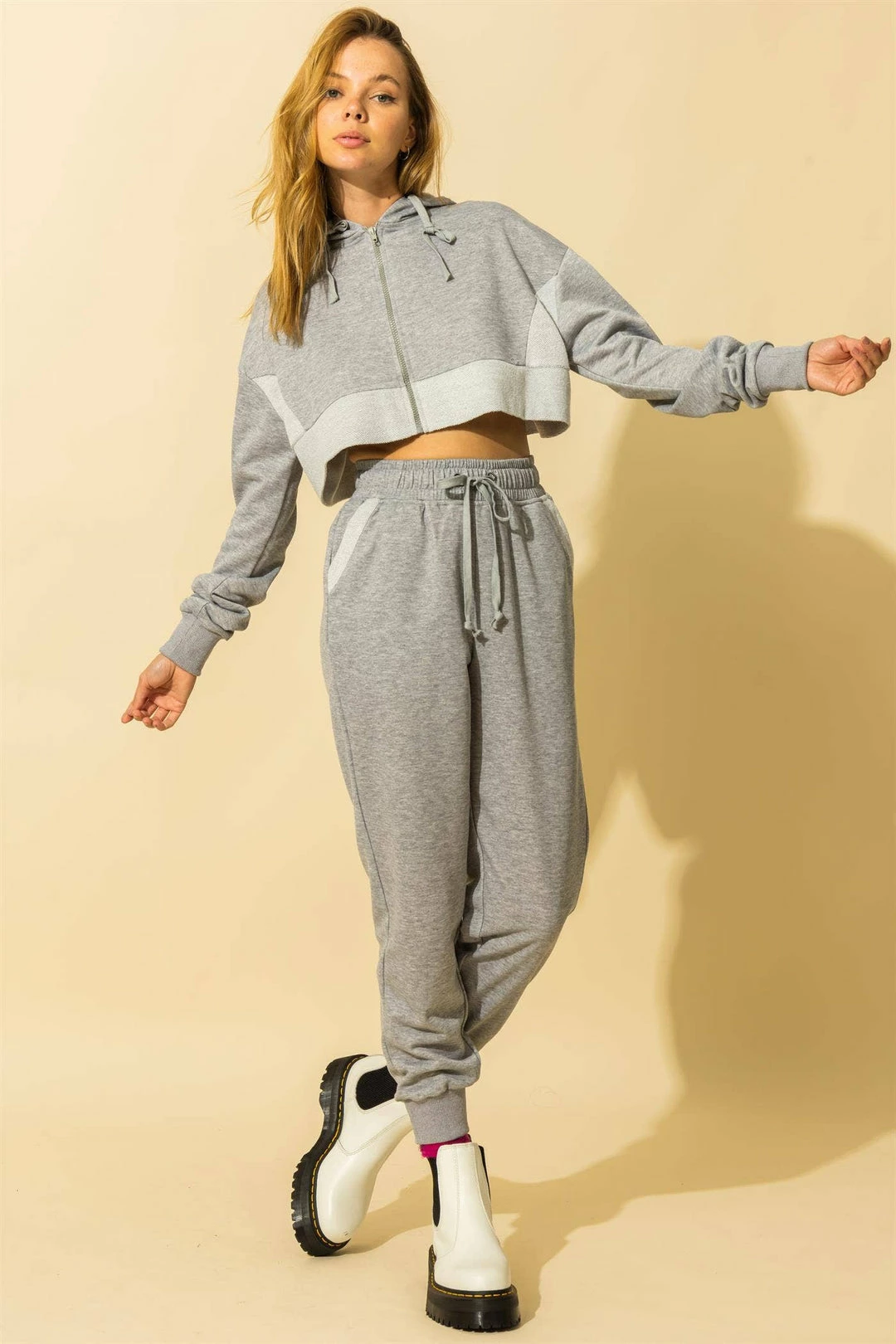 Grey cropped jacket and pant set. Designed in the USA.