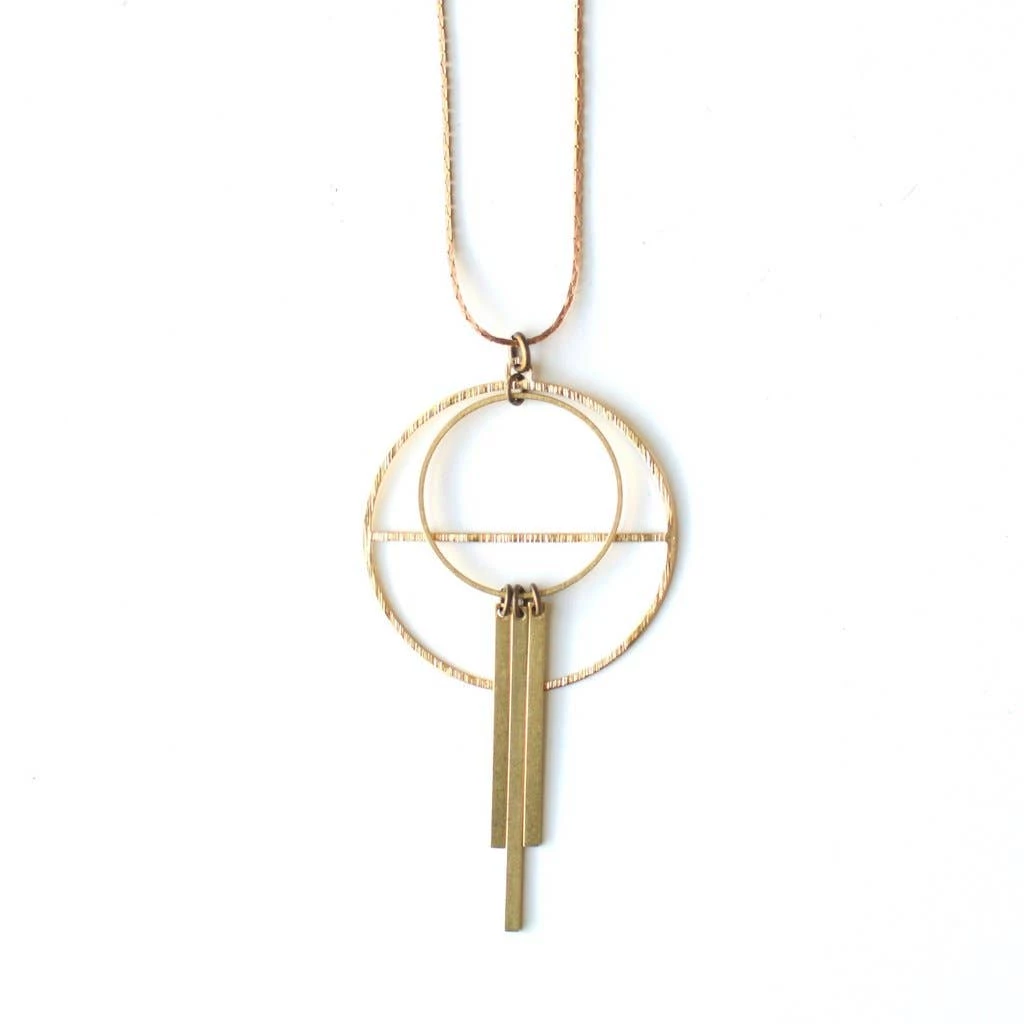 This art deco design features a double raw brass hoop pendant with brass bar accents. The pendant hangs on 30” brass snake chain.