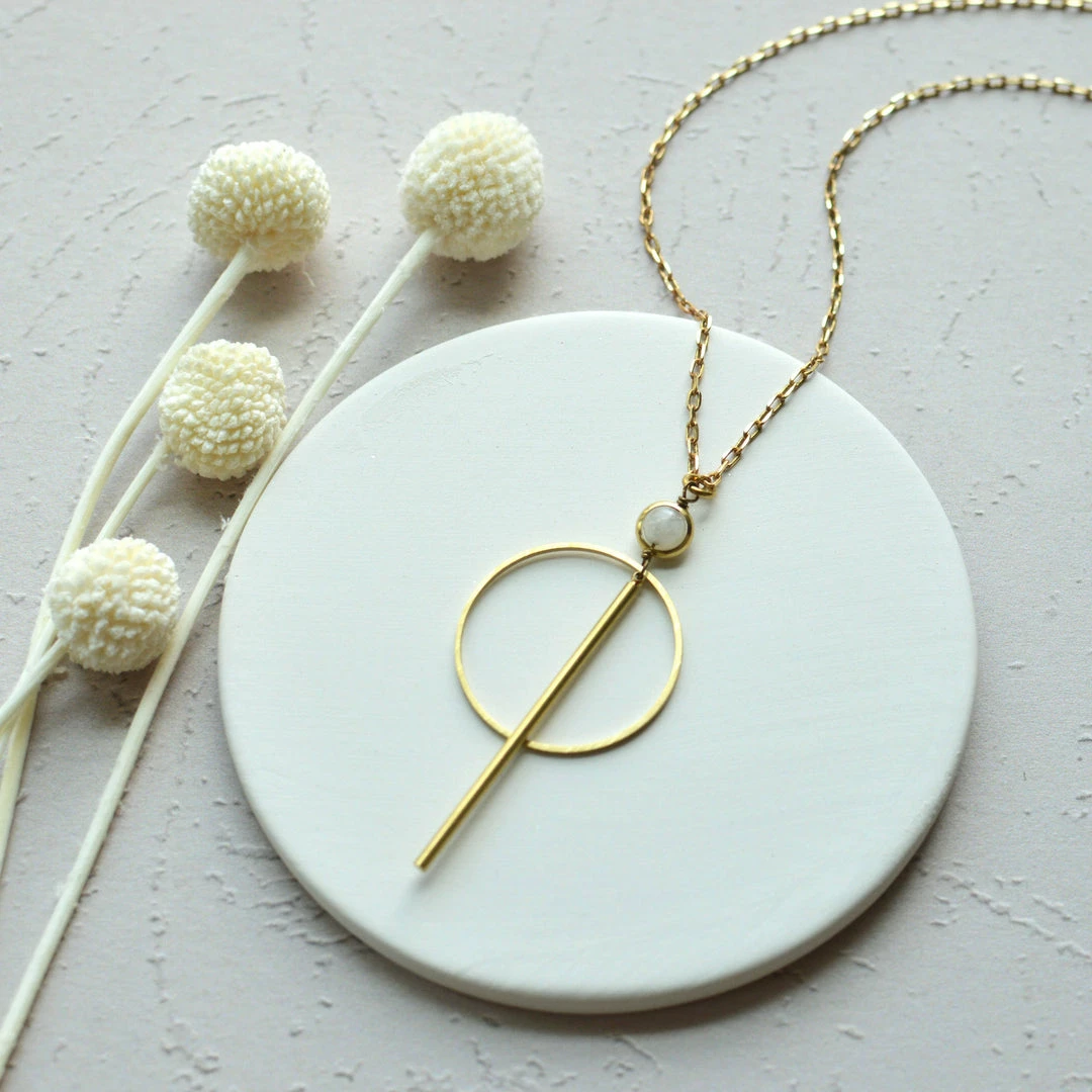 This necklace features a natural moonstone with brass hoop and rod on 28” brass link chain. Pendant is 2.5” long.