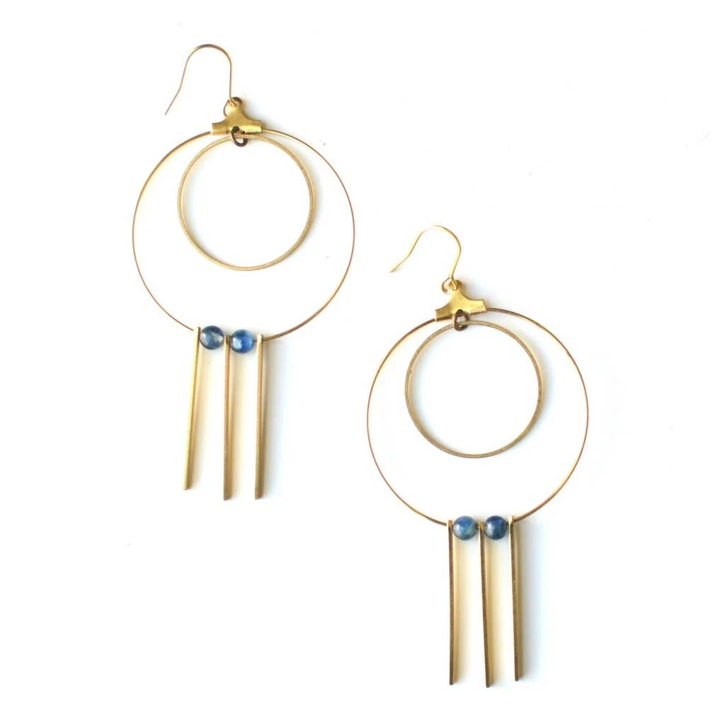 These double hoop brass earrings feature kyanite accent beads with brass bar charms. Earrings are 1.5” in diameter and hang 3.5” in length. Earring hooks are brass.