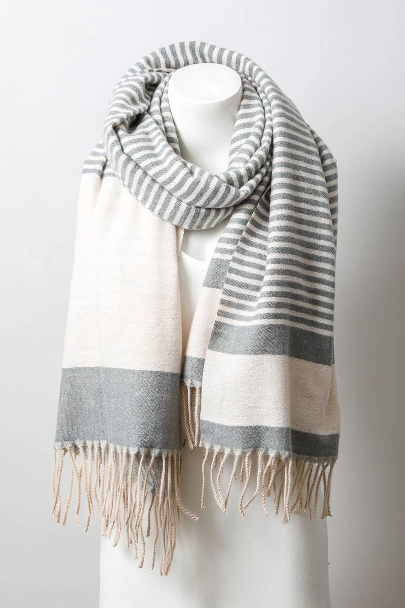 Grey and White Contemporary Stripe Woven Tassel Scarf .