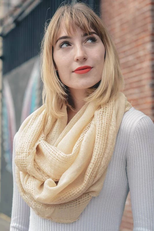 Open Grid Infinity Scarf with Frayed Edges 100% Acrylic.