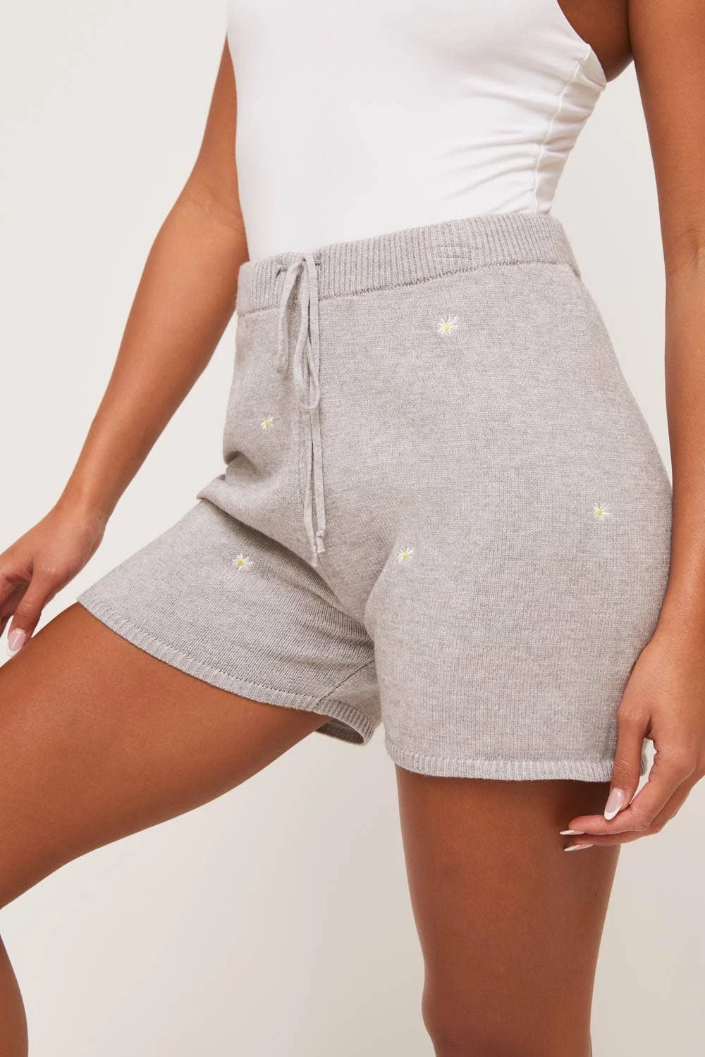 Floral Embroidered Knit Shorts. Drawstring tie with elastic waistband.