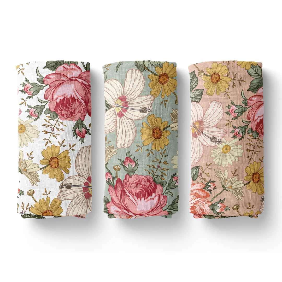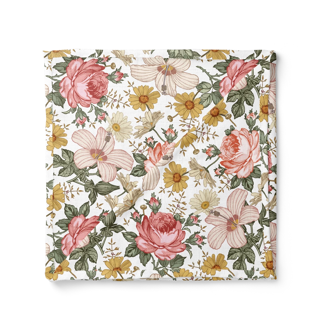 Swaddle your little girl in the comfort of wildflowers with this garden floral cotton muslin blanket. These lightweight cotton blankets feature an earthy blend of greens, yellows, pinks, and cream hues to hint at a fragrant garden bursting into life during a warm spring day. Ideal for spring newborn photo shoots, or any time you want to treat your baby girl to a bouquet in fabric form, you will love holding her as she luxuriates in the comfort of a perfectly placed swaddle.