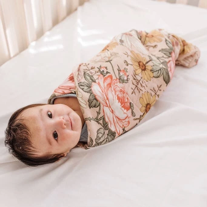Swaddle your little girl in the comfort of wildflowers with this garden floral cotton muslin blanket. These lightweight cotton blankets feature an earthy blend of greens, yellows, pinks, and cream hues to hint at a fragrant garden bursting into life during a warm spring day. Ideal for spring newborn photo shoots, or any time you want to treat your baby girl to a bouquet in fabric form, you will love holding her as she luxuriates in the comfort of a perfectly placed swaddle.