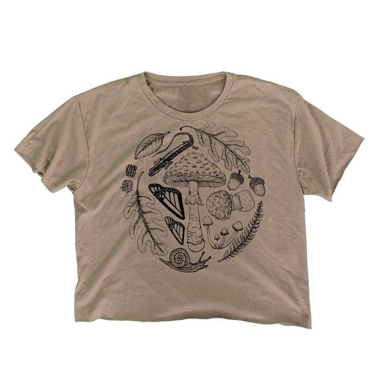 Original Forest Floor Illustration printed on a brown crop top Hand Printed & Shipped by the Nature Walk Studio Team High-quality in-house screen printed. Cotton/poly blend. Original Design.