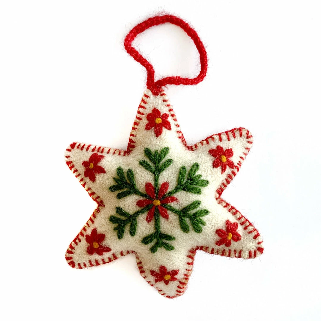 A simple and timeless design, our felted embroidered wool star ornament is handmade by artisans in Peru, South America using traditional craftsmanship. Each felt white star is handstitched and embellished with iconic Christmas colors. celebrate the old fashioned way with this classic style.