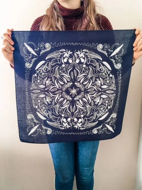 This 22” cotton bandana features illustrations of all of your favorite woodland plants. The design is silk screened in white ink on the blue fabric. This bandana can be worn as a face covering, a decorative hair tie, a hair accessory, headband, and more!