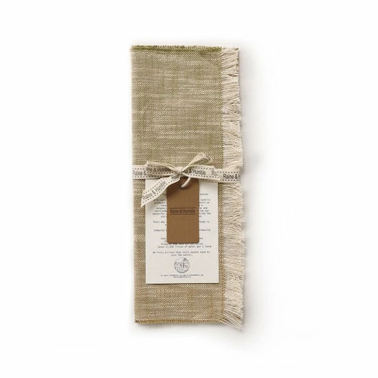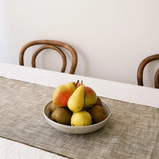 16″ x 60″, 100% recycled cotton runner in textured weave. Khaki green with fringed ends.