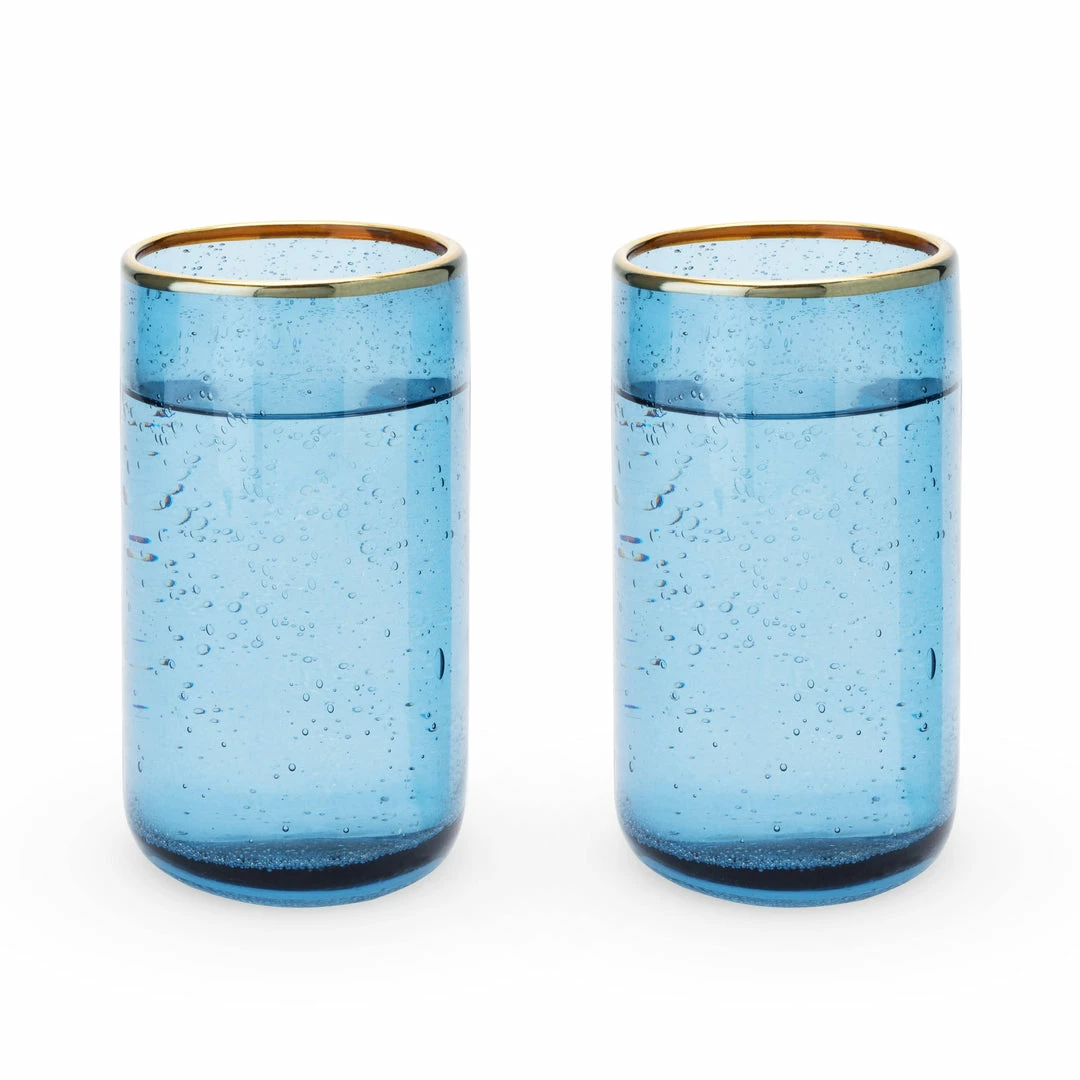 A series of delicate bubbles sit suspended in deep blue-tinted glass while a laurel of gleaming gold plating adorns the rim, adding a vestige of intrigue to an already stunning set of glassware. Designed to contain 16 ounces comfortably, each tumbler is impeccably suited to accommodate any of your favorite mixed beverages.—Set of 2–Holds 16 ounces each–Bubbled glass detail–Electroplated gold rim–Makes a great gift–