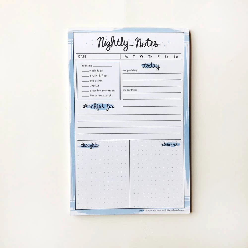Our “Nightly Notes” tracker focuses on creating a healthy, productive bedtime routine in order to help quiet the brain for a restful night’s sleep.