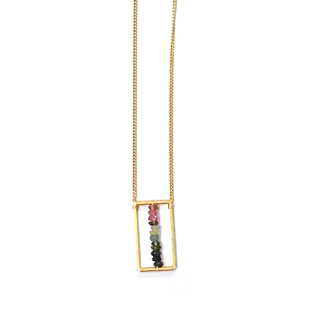 This tourmaline necklace is a very a unique design. The rectangular shape around a simple line of tourmaline beads really shows off the amazing and beautiful range of colors in tourmaline.Β The array of colors in these earrings are sure to brighten your day.Β These match our tourmaline rectangle earrings.