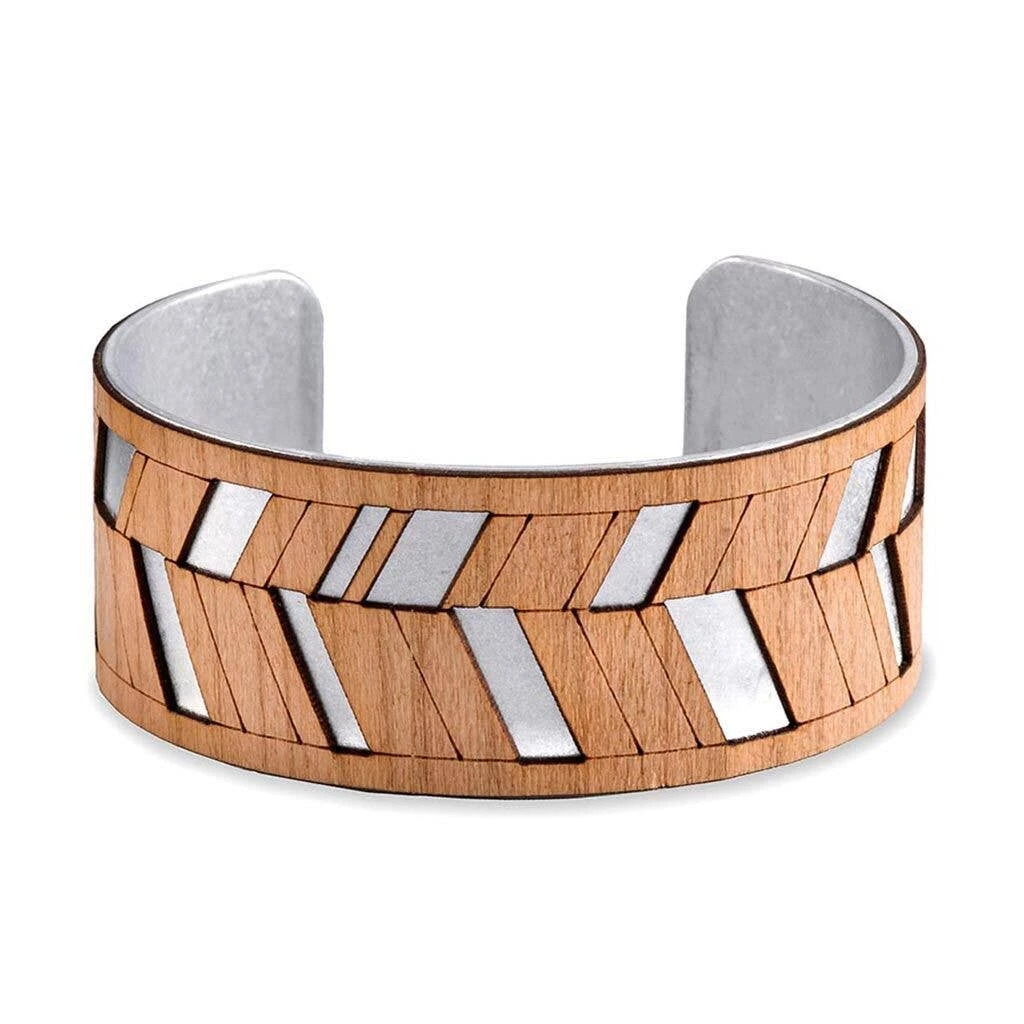 The chevron cuff bracelet is lightweight and adjustable. Hand-brushed aluminum contrasts with rich cherry wood to make a beautifully simple statement.